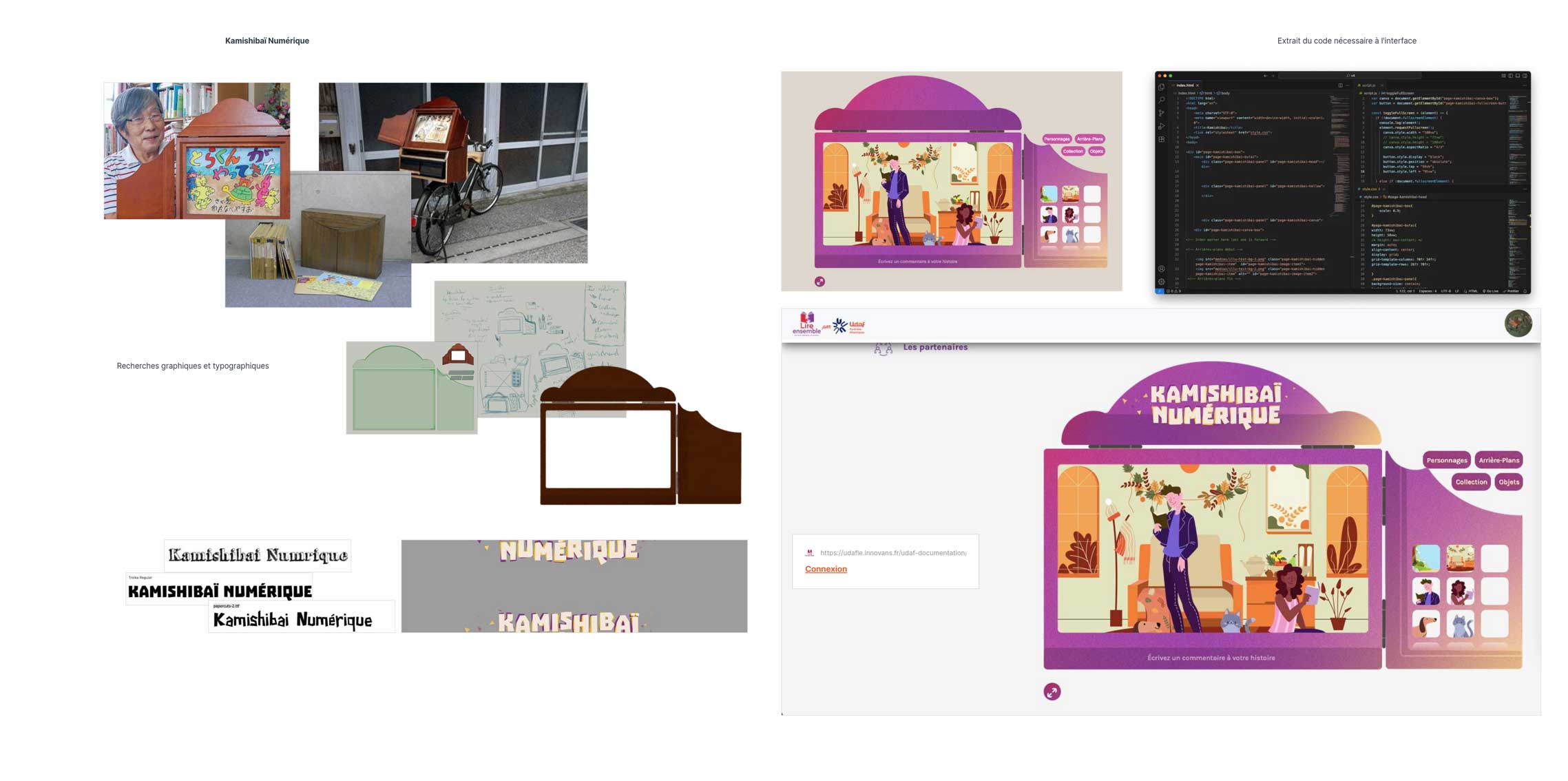 J’ai pu coder l’outil (en html, css et javascript) et réaliser les graphismes de l’interface. Puis j’ai dessiné les illustrations composites du kamishibaï. De plus, avec les collègues de l’Udaf, j’ai pu ajuster graphiquement les interfaces du site en manipulant le code et le Wordpress.